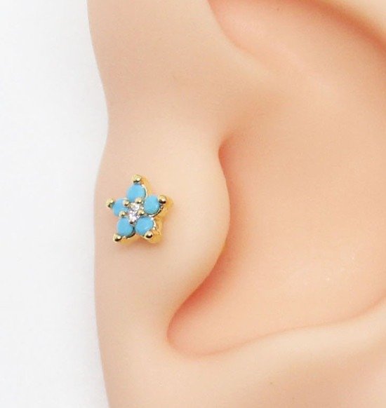 Piercing para Tragus ou Cartilagem de Flor Cravejada de Pedras Turquesas Folheada a Ouro.