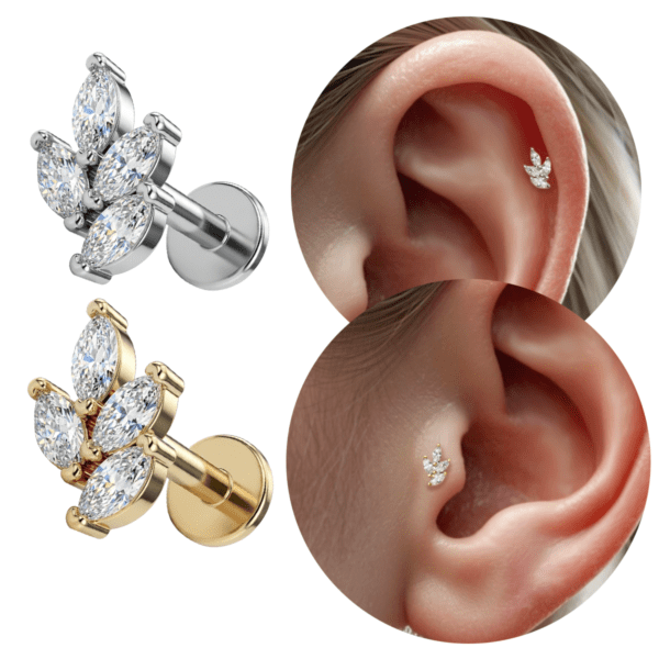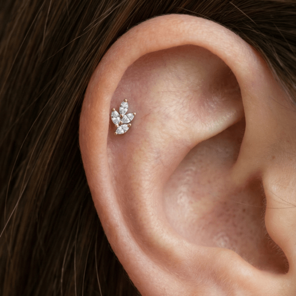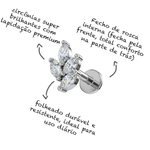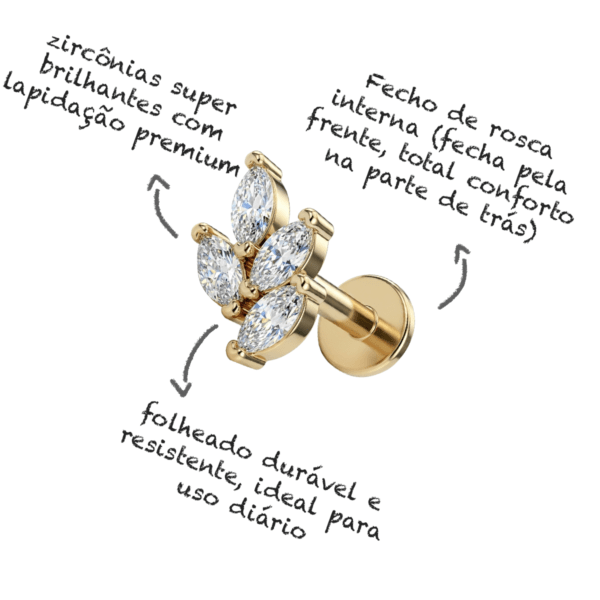O piercing de mini ramo é uma joia delicada cravejada com zircônias ultra brilhantes. Seu folheado é reforçado, garantindo durabilidade para uso diário. Haste com fecho seguro e confortável de rosca interna e haste de 8mm.